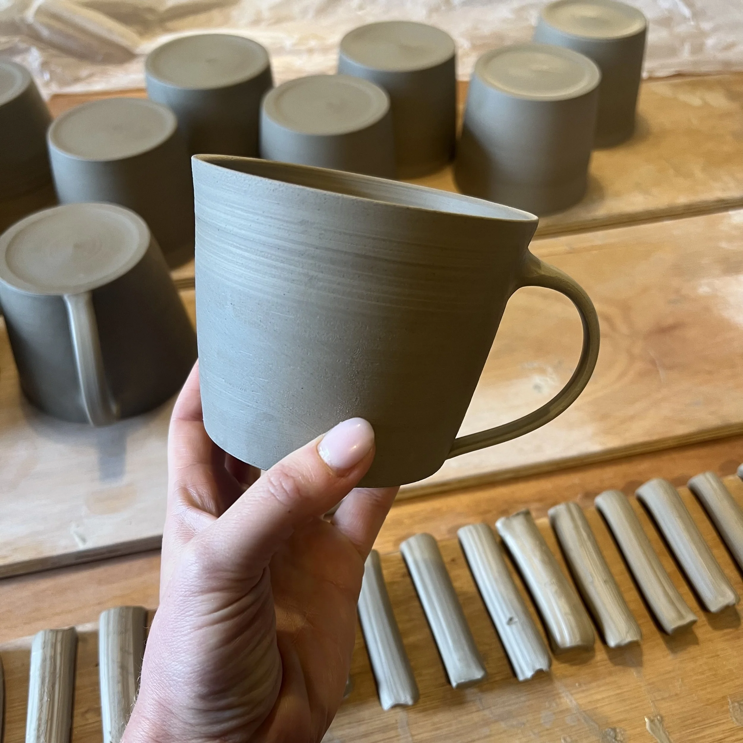 Finishing off project pieces to get pieces ready for the bisique firing including trimming, handles and any slips or surface decoration.